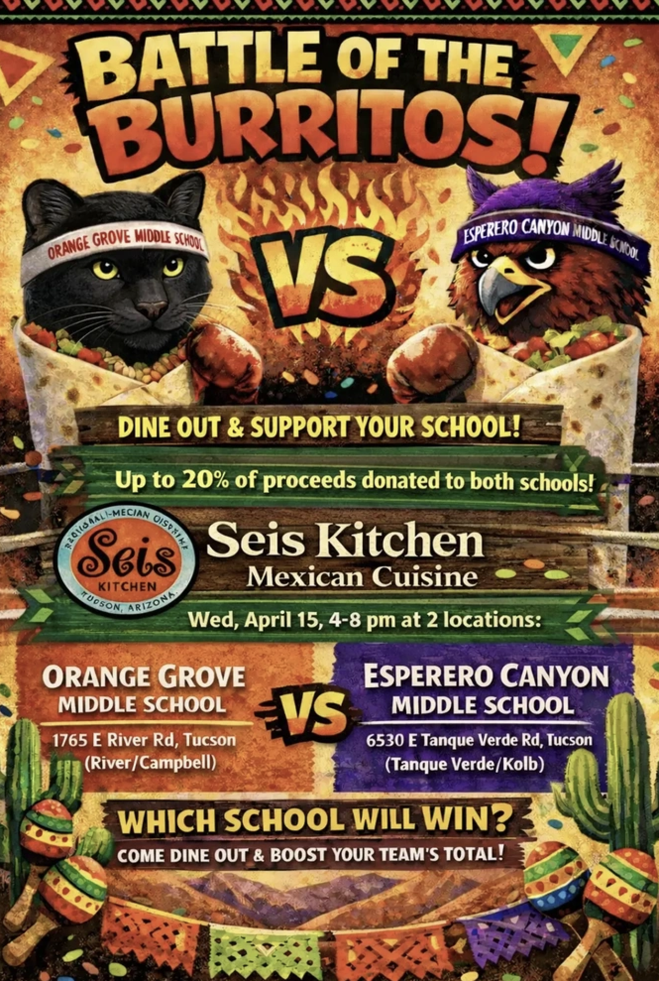 LAST DINE OUT OF THE SCHOOL YEAR – LET’S GO, EAGLES! It all comes down to this… the Battle of the Burritos is ON!Join us for our final dine out of the year at Seis Kitchen and help Esperero take th...