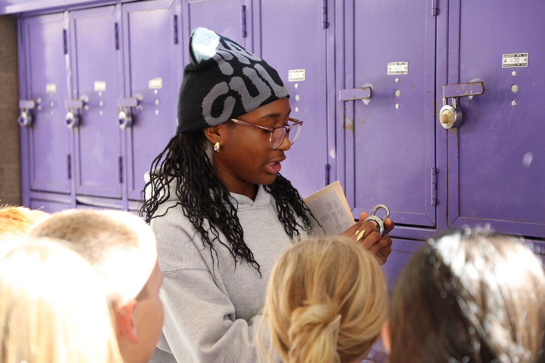 But for many, the most anticipated stop was the hallway lined with lockers. The ambassadors demonstrated the spin-click-spin of a combination lock, then stepped back and let the fifth graders try. Some cracked it on the first attempt. Others will need more practice. All of them wanted to try again.