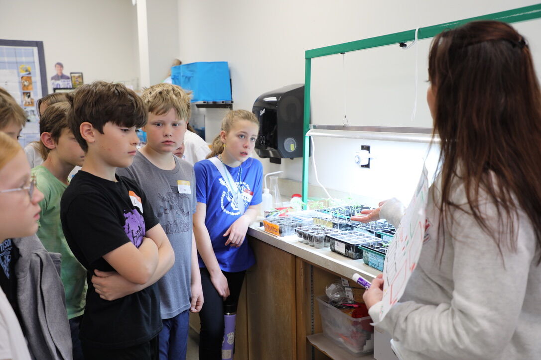 Fifth graders crowd around seedling trays under grow lights as they learn about the Tomatosphere research project during their visit to Ms. Smith’s science classroom.