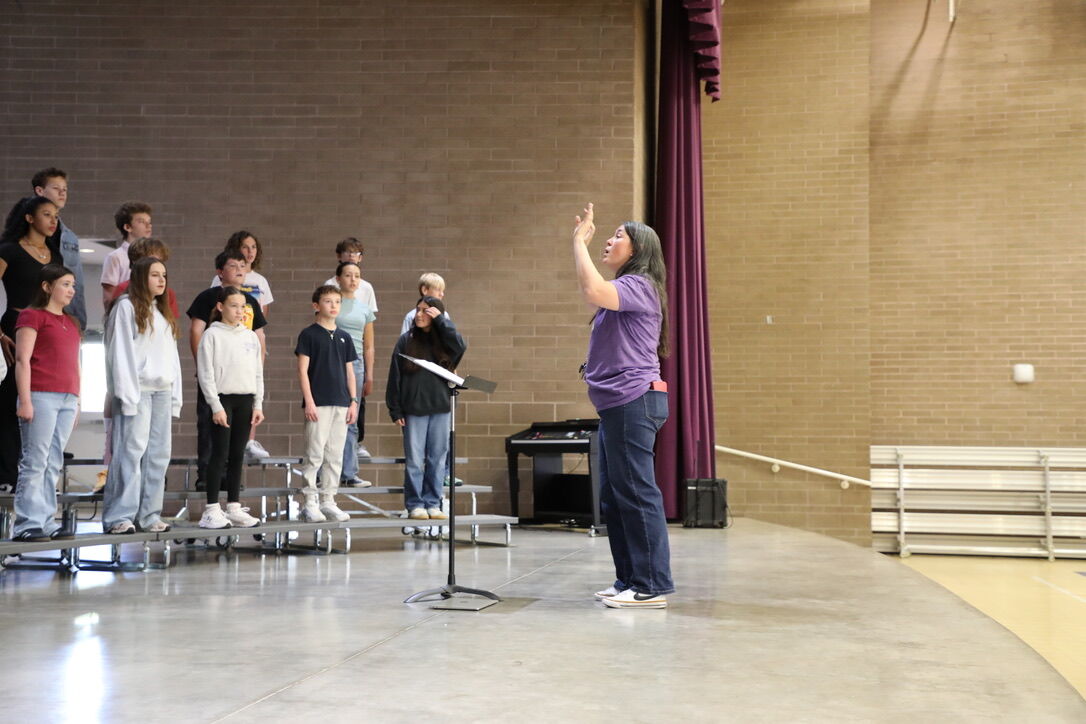 Ms. Julia Higgins leads to Esperero Canyon Middle School choir as they perform for visiting fifth graders.