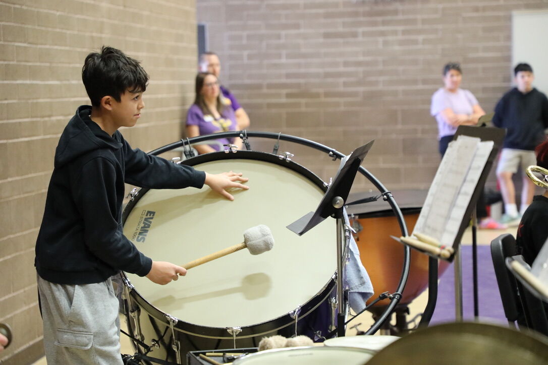 A percussionist carefully follows the band director during a performance for visiting fifth graders.